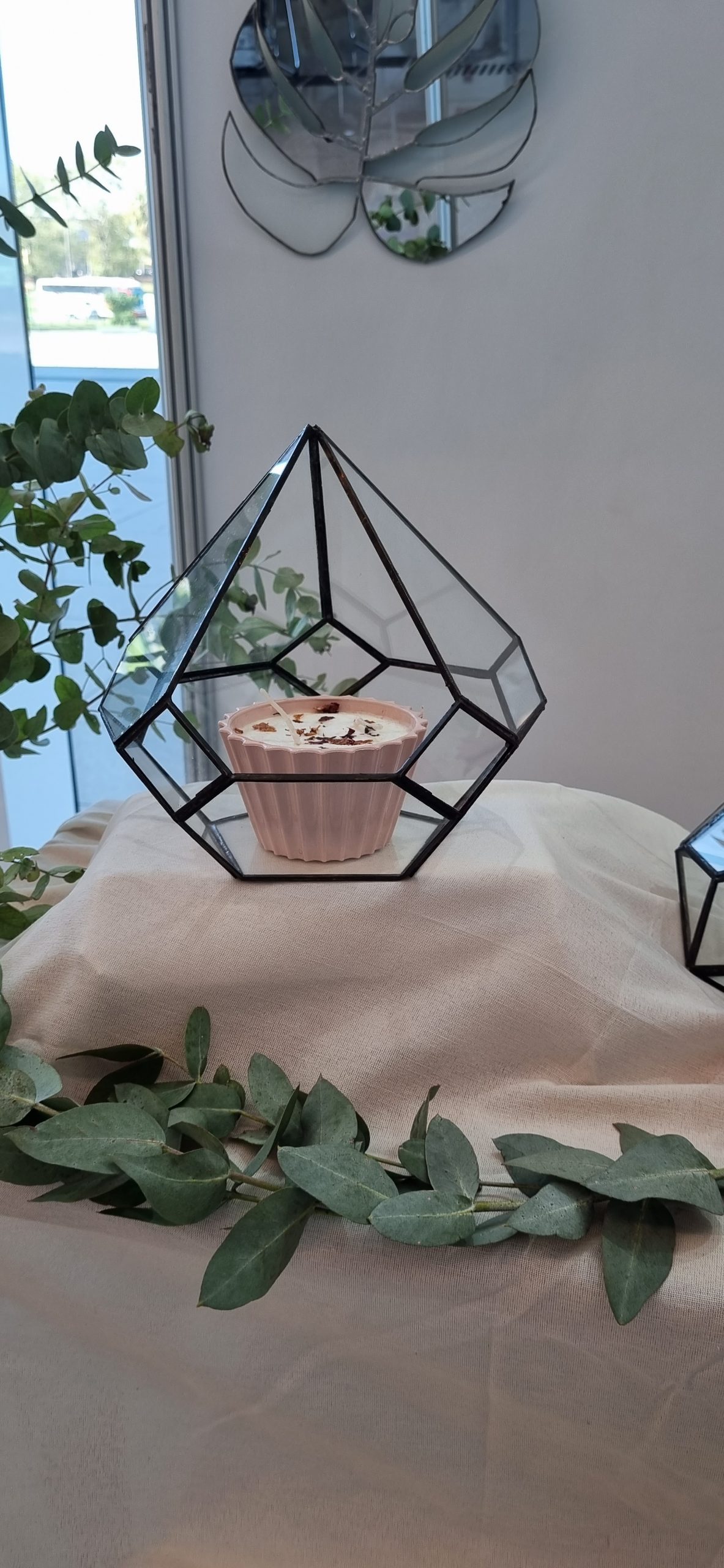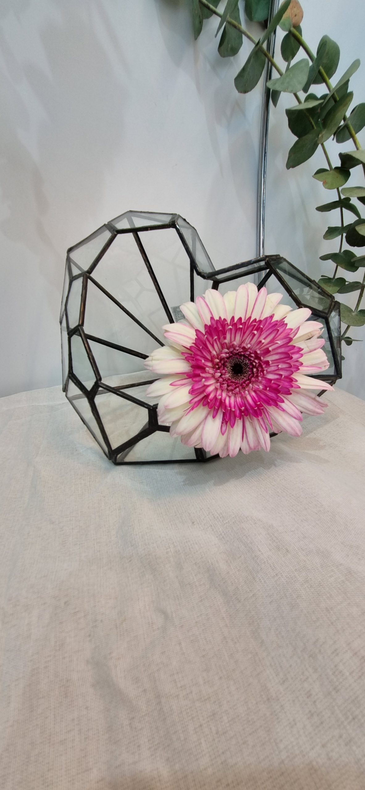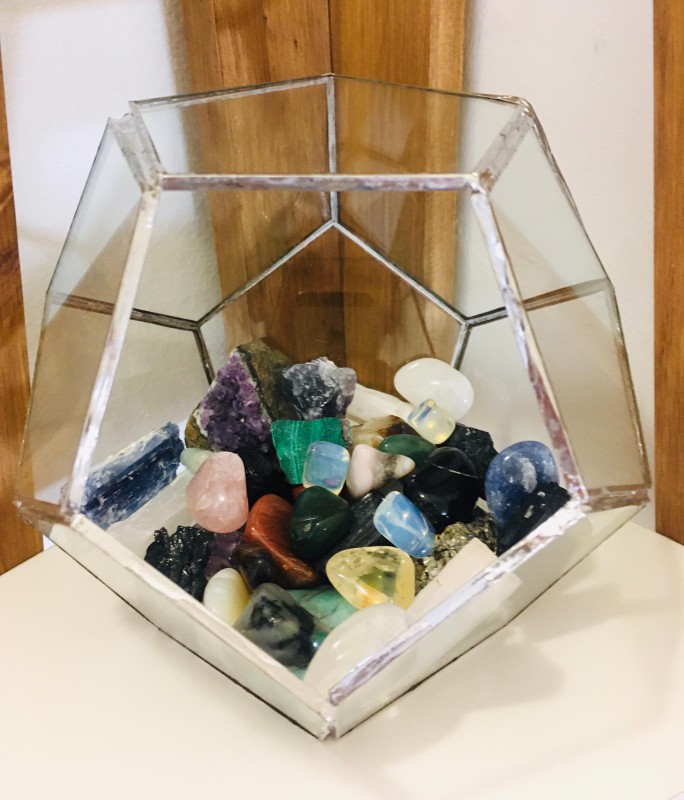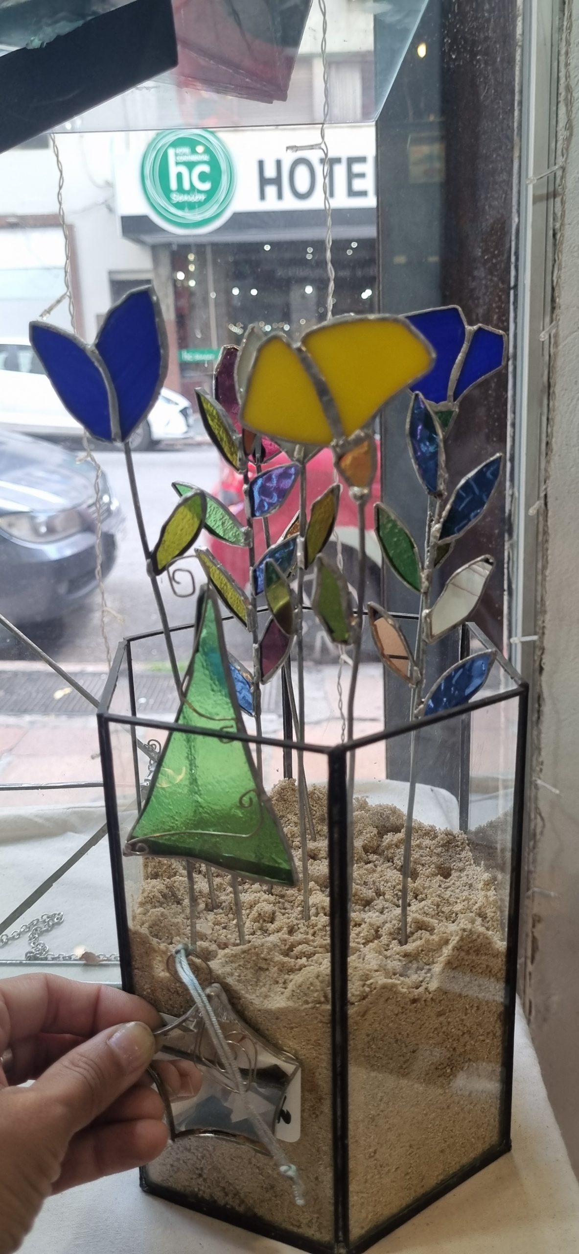 Técnica Universitaria en Artes del Fuego, realizo objetos decorativos en vidrio aplicando la técnica Tiffany utilizando vidrios transparentes, de colores, espejos y vidrios de botellas recicladas.