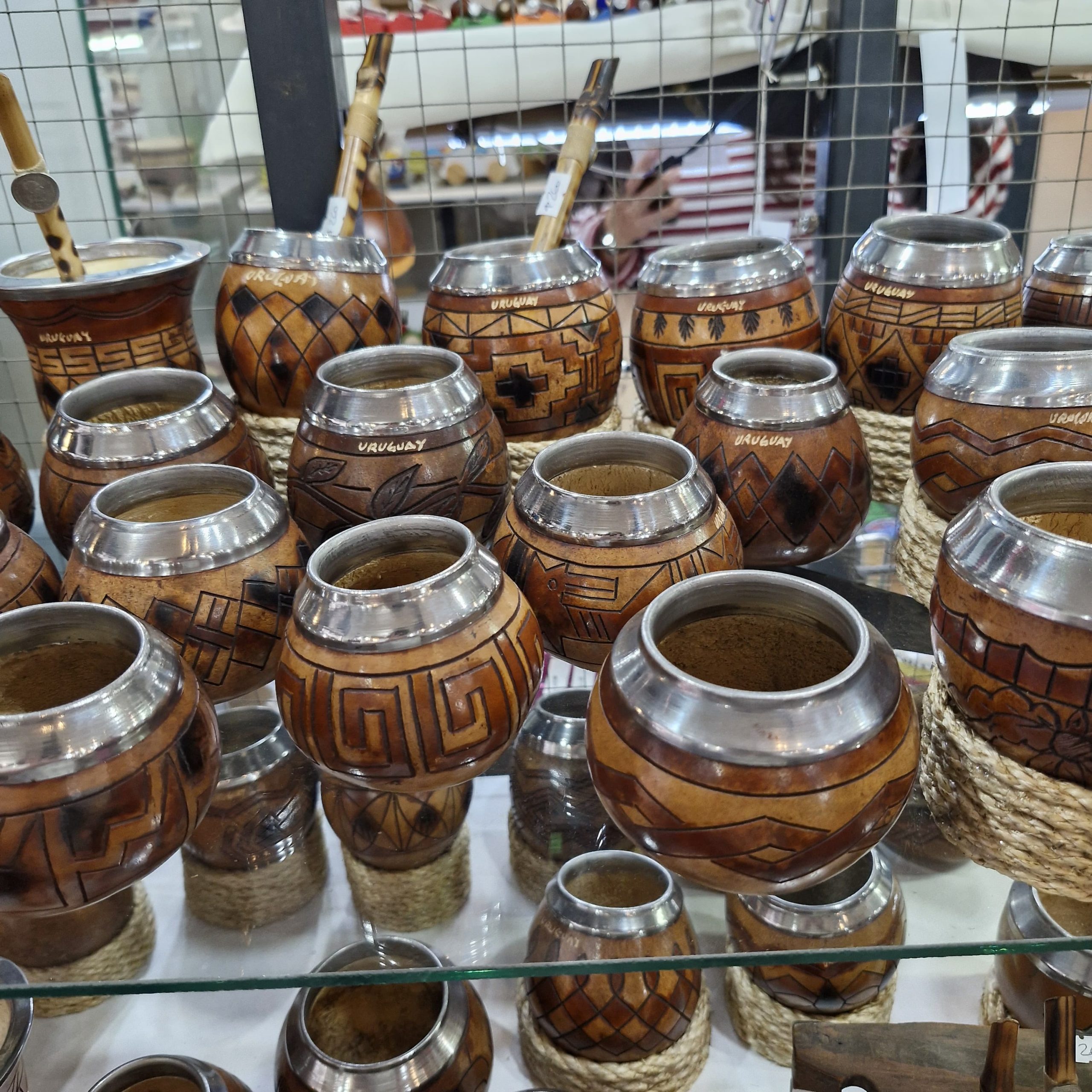 mates tallados y pintados a mano, bombillas y posa mates. Artesano Fredy Martínez