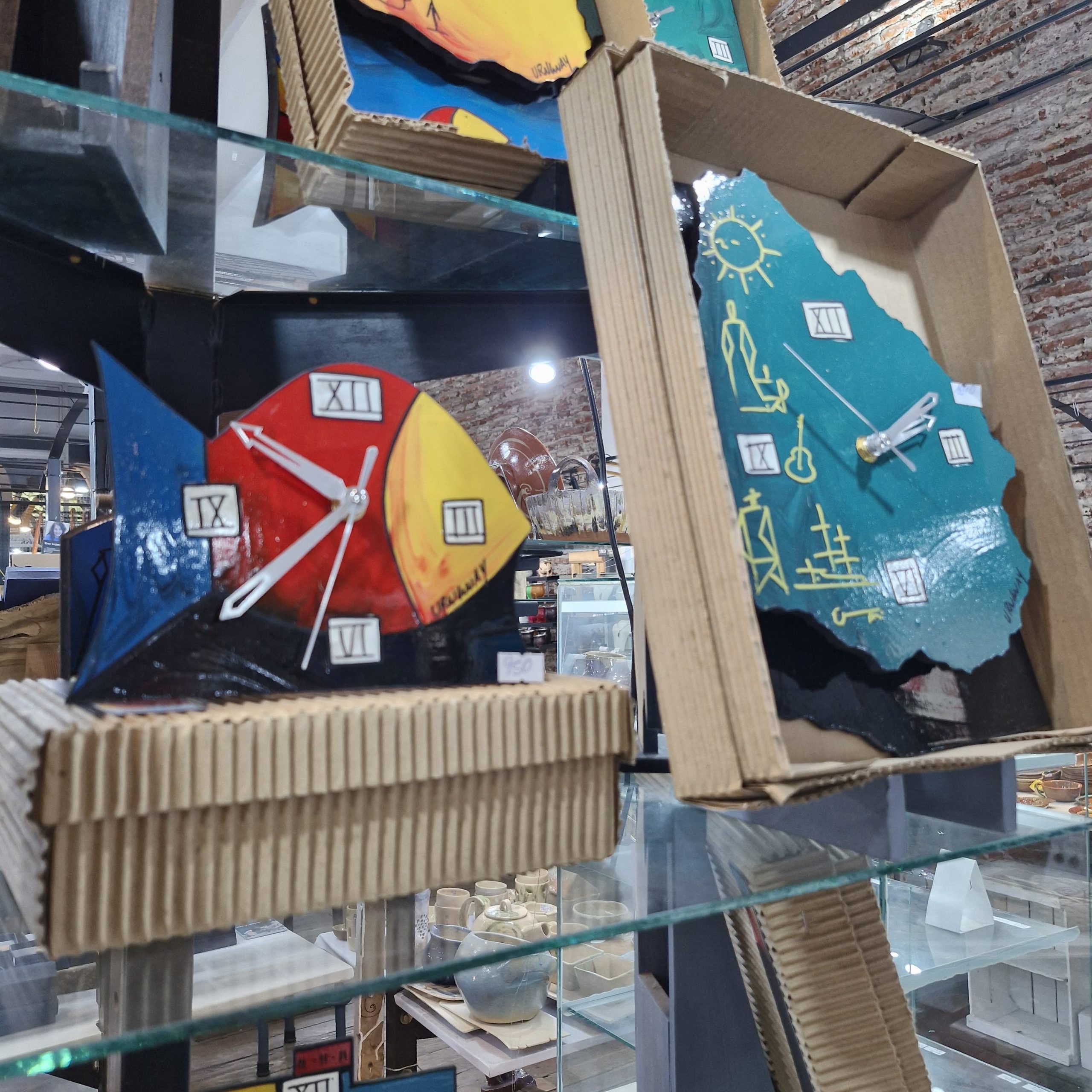 Relojes de pared y cajas. Madera pintada y laqueada.